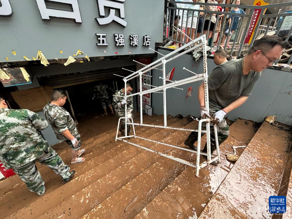 6月23日,沅陵縣五強(qiáng)溪鎮(zhèn)當(dāng)?shù)卣M織力量幫助沿街商鋪搬運(yùn)被洪水浸泡的物品(手機(jī)照片)。