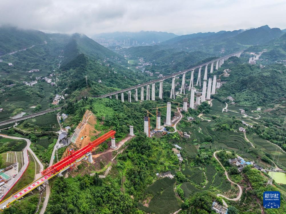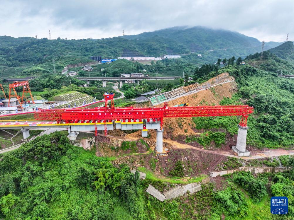 6月26日,渝萬高鐵新橋雙線特大橋建設(shè)現(xiàn)場,架橋機(jī)在架設(shè)首孔64m節(jié)段拼裝梁(無人機(jī)照片)。