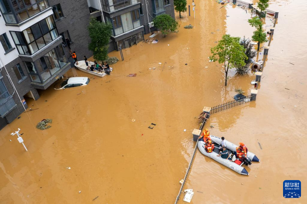 7月2日,在平江縣大橋西路附近,消防員在轉(zhuǎn)移群眾(無人機照片)。
