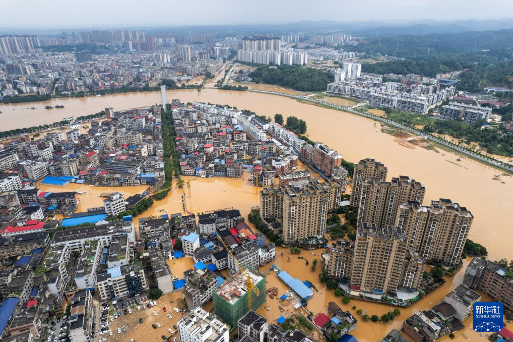 這是7月2日在湖南省岳陽市平江縣縣城拍攝的內(nèi)澇現(xiàn)場(無人機照片)。