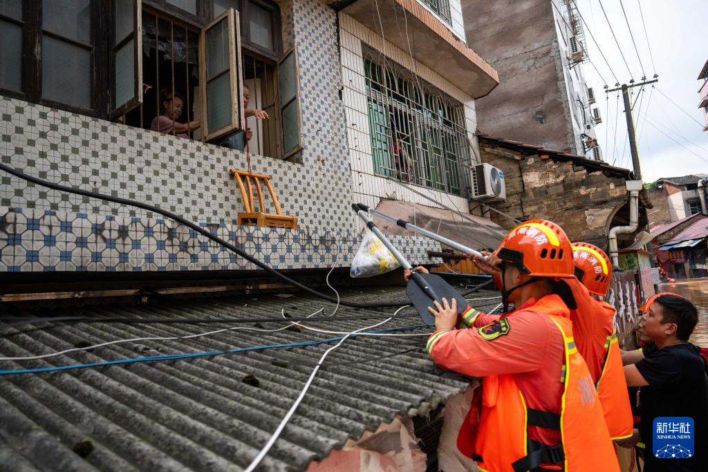 7月2日,在平江縣大橋西路附近,消防員在轉(zhuǎn)移群眾。