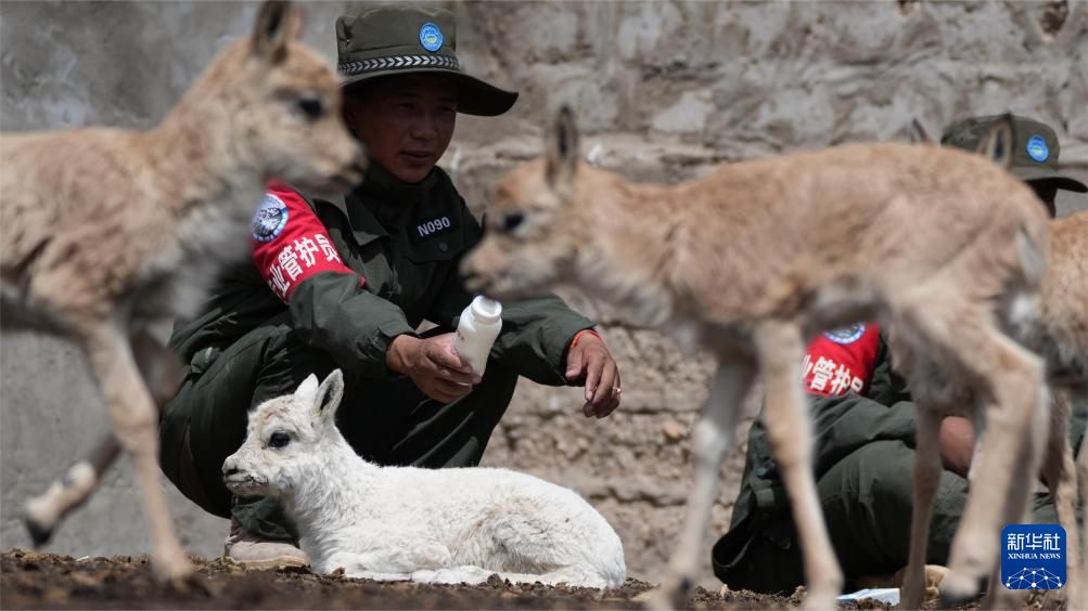尼瑪縣措羅木管護(hù)站野保員在給白色藏羚羊幼崽喂奶(7月13日攝)。