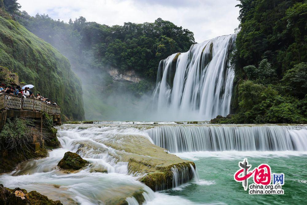 7月18日,游客在黃果樹瀑布景區(qū)欣賞壯觀瀑布景觀。中國網(wǎng)記者 董寧 攝影