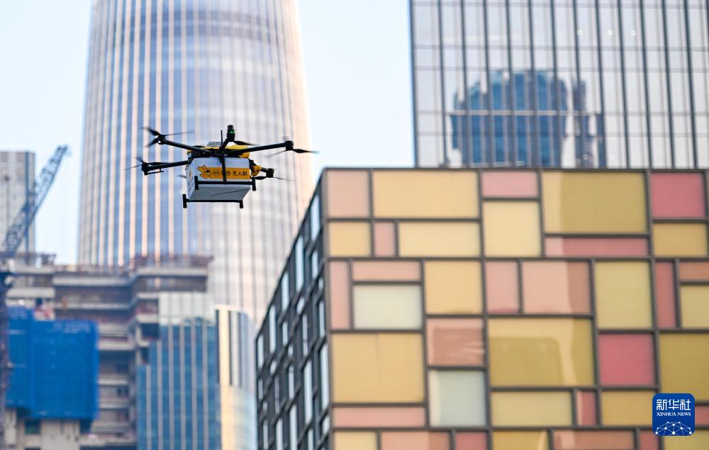 2023年11月24日,一架送餐無人機(jī)穿行在深圳市后海片區(qū)的樓宇之間。