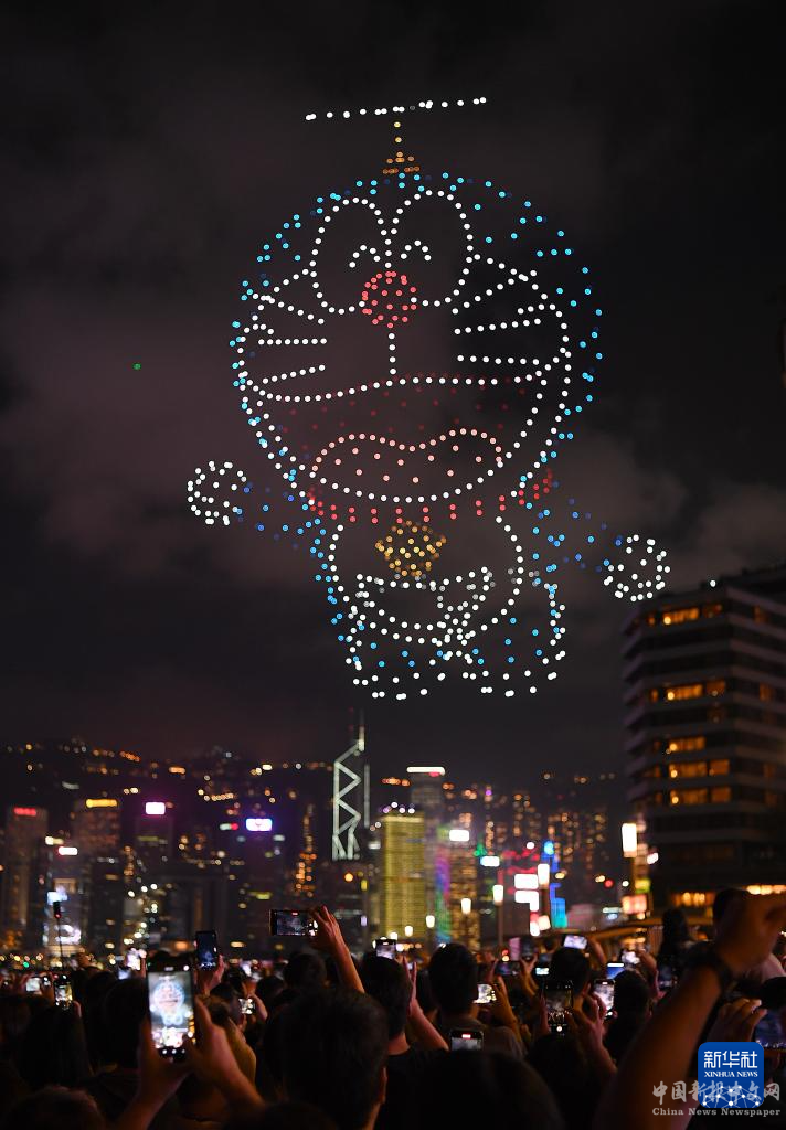 5月25日,無人機在維港上空拼成“哆啦A夢”經(jīng)典角色圖案。