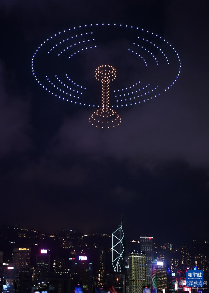 5月25日,無人機在維港上空拼成“竹蜻蜓”圖案。