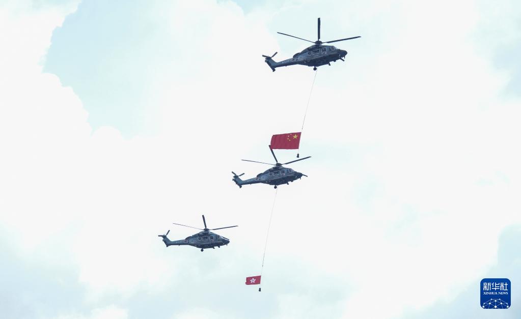 7月1日,香港特區(qū)政府在金紫荊廣場(chǎng)舉行升旗儀式,慶祝香港回歸祖國(guó)27周年。這是分別懸掛中華人民共和國(guó)國(guó)旗、香港特區(qū)區(qū)旗的直升機(jī)從空中飛過(guò)。