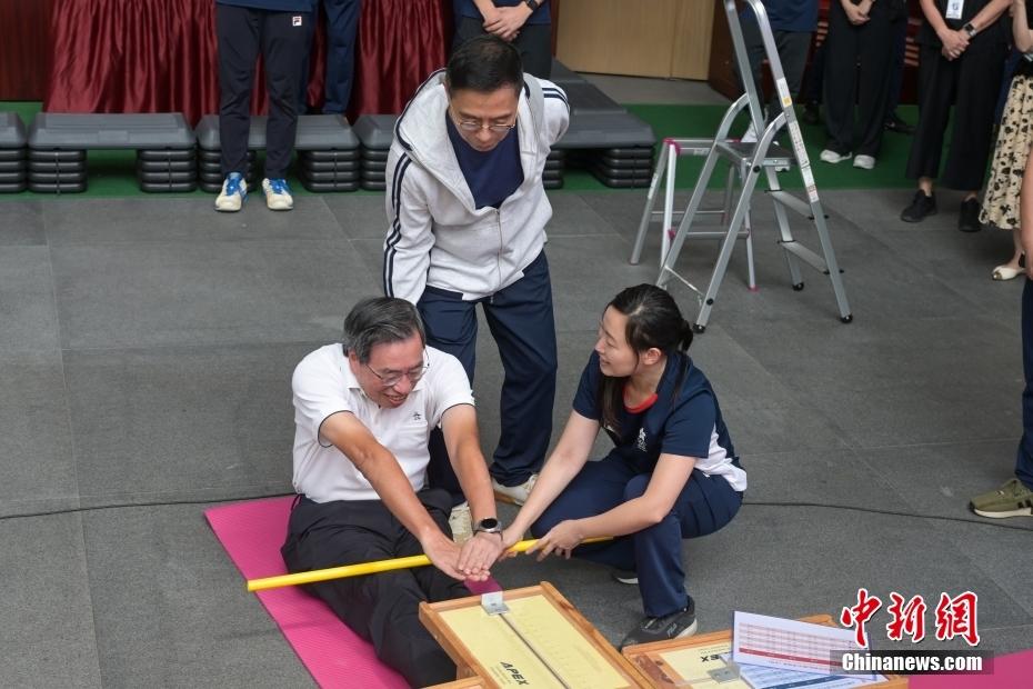 7月12日,香港特區(qū)立法會舉辦巴黎奧運打氣活動,香港特區(qū)政府文化體育及旅游局局長楊潤雄表示,香港運動員在過去一段時間,在許多國際賽上取得很好的成績,除了靠運動員的努力,也離不開背后的團隊,以及立法會乃至特區(qū)政府對發(fā)展精英運動的支持。圖為香港特區(qū)立法會主席梁君彥坐體前伸。中新社記者 陳永諾 攝