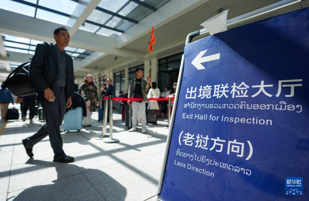 這是12月3日在中老鐵路磨憨站拍攝的去往老撾方向的出境聯(lián)檢大廳指示牌。