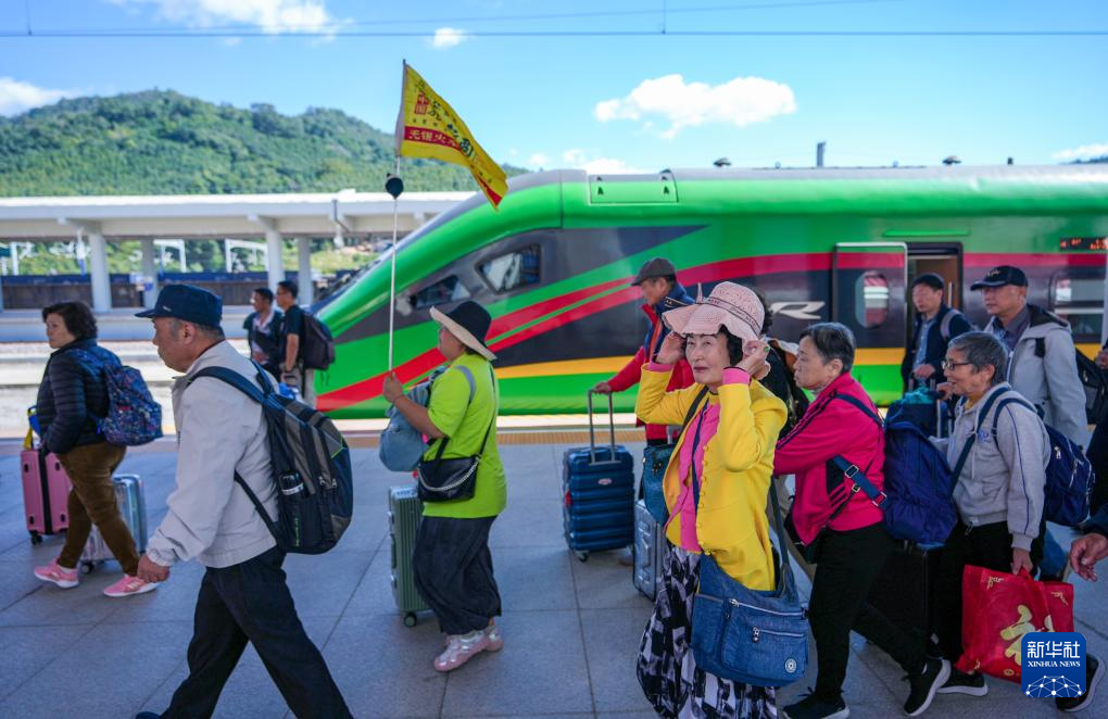 12月3日,旅客乘坐列車抵達(dá)中老鐵路磨憨站。