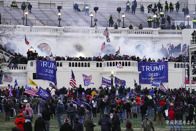 △2021年1月6日,美國國會(huì)認(rèn)證選舉結(jié)果期間,大批特朗普支持者暴力闖入國會(huì)大廈并釀成騷亂,造成人員傷亡。