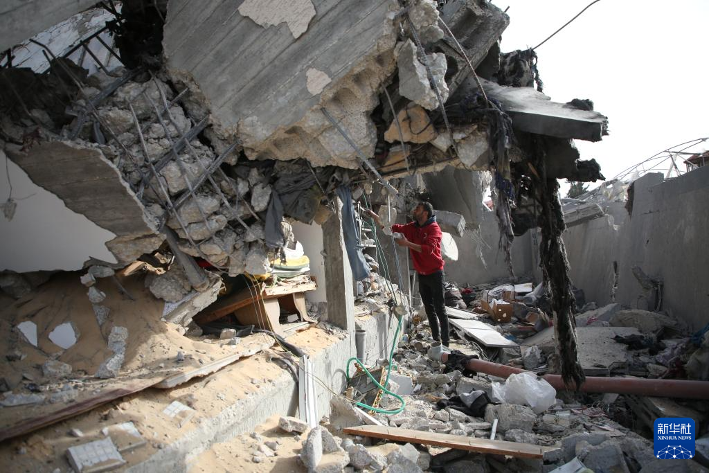 3月26日,在加沙地帶南部城市拉法,人們?cè)趶U墟中收集物品。