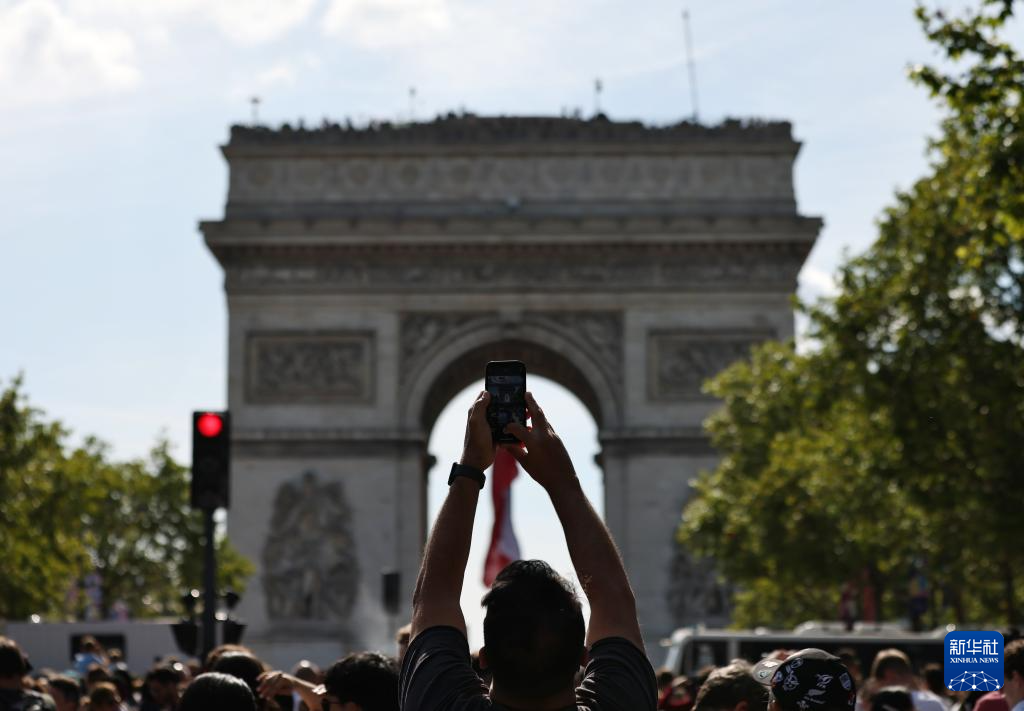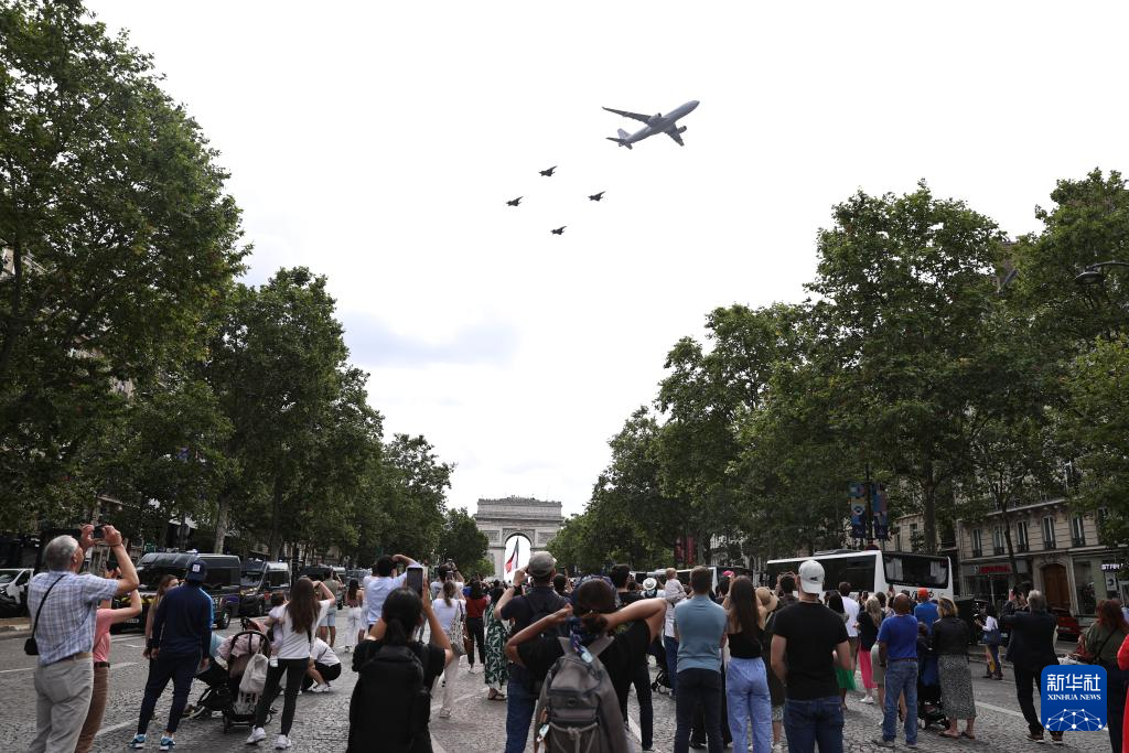 這是7月14日在法國巴黎凱旋門附近拍攝的國慶閱兵式現(xiàn)場。