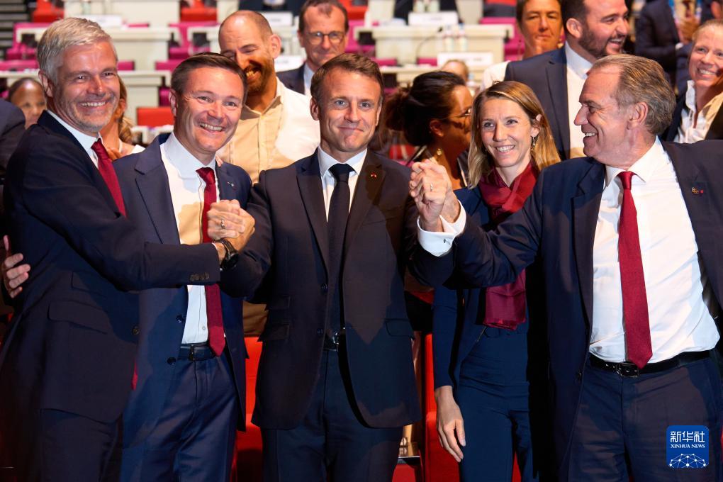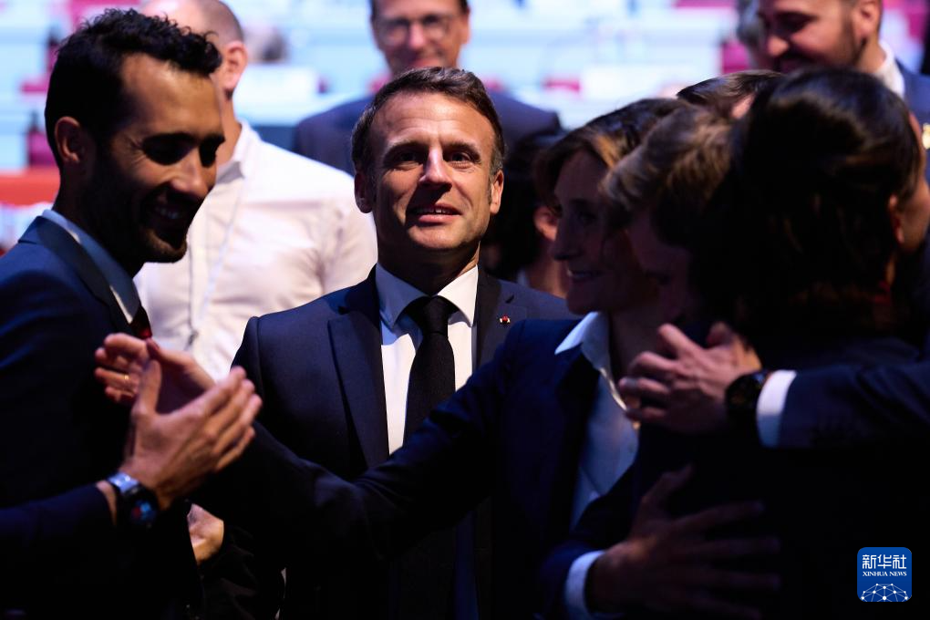 7月24日,法國總統(tǒng)馬克龍(中)慶祝法國阿爾卑斯山地區(qū)獲得2030年冬奧會(huì)舉辦權(quán)。