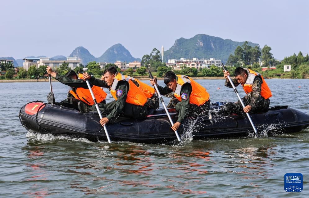 中越雙方隊員在水面進行操(劃)舟課目訓練(7月26日攝)。新華社發(fā)(何其駿 攝)