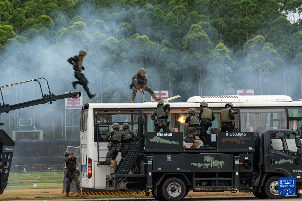 中越雙方隊員在公交車反劫持演練中對“暴恐分子”發(fā)起突擊(7月31日攝)。新華社發(fā)(陳綠祥 攝)