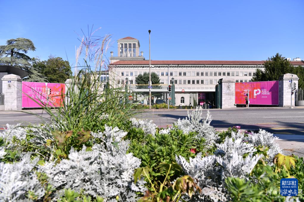 這是9月10日在瑞士日內(nèi)瓦世界貿(mào)易組織總部拍攝的世貿(mào)組織2024年公共論壇標(biāo)識。