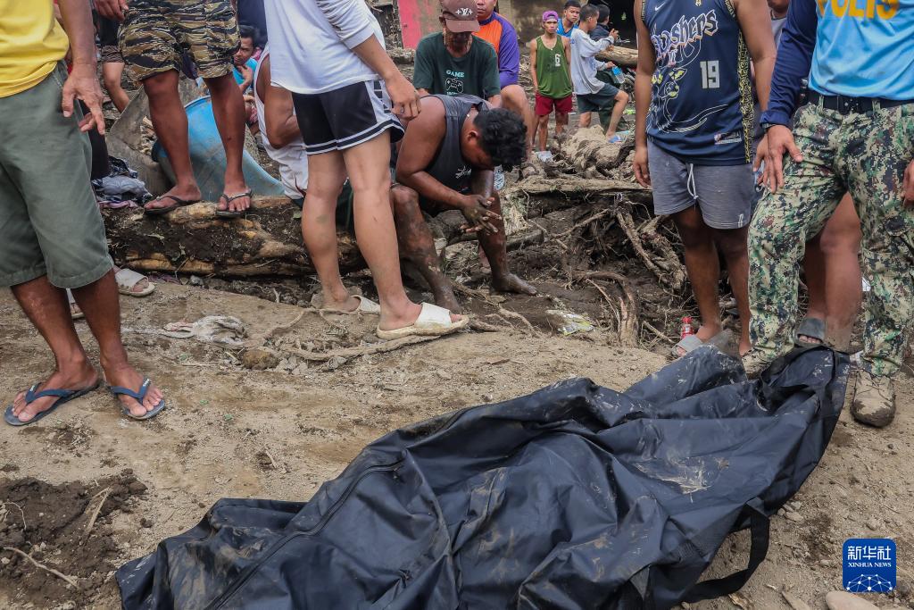 10月25日,在菲律賓八打雁省,一名男子(中)確認(rèn)親人因山體滑坡遇難后傷心落淚。