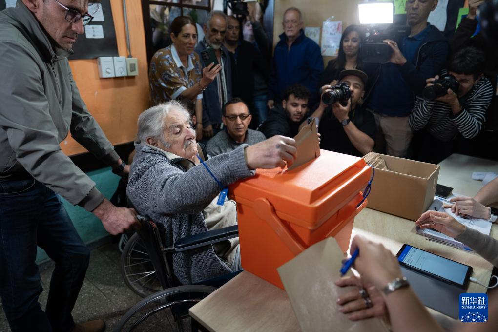 10月27日,烏拉圭前總統(tǒng)何塞·穆??ㄔ谑锥济傻镁S的亞的一處投票站投票。