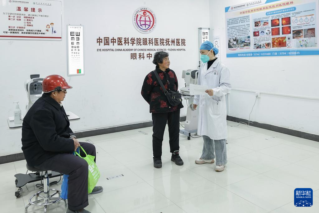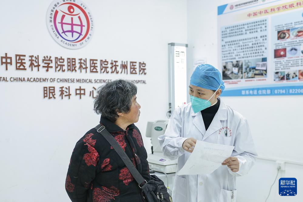 12月12日,胥思洋在撫州市中醫(yī)醫(yī)院門診為聞訊趕來求醫(yī)的白內(nèi)障患者講解篩查結(jié)果。
