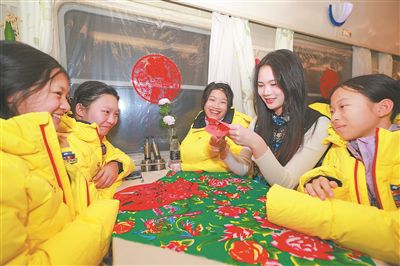 圖為非遺項(xiàng)目剪紙文化傳承人趙娜帶領(lǐng)學(xué)生們體驗(yàn)剪窗花民俗。王聰攝