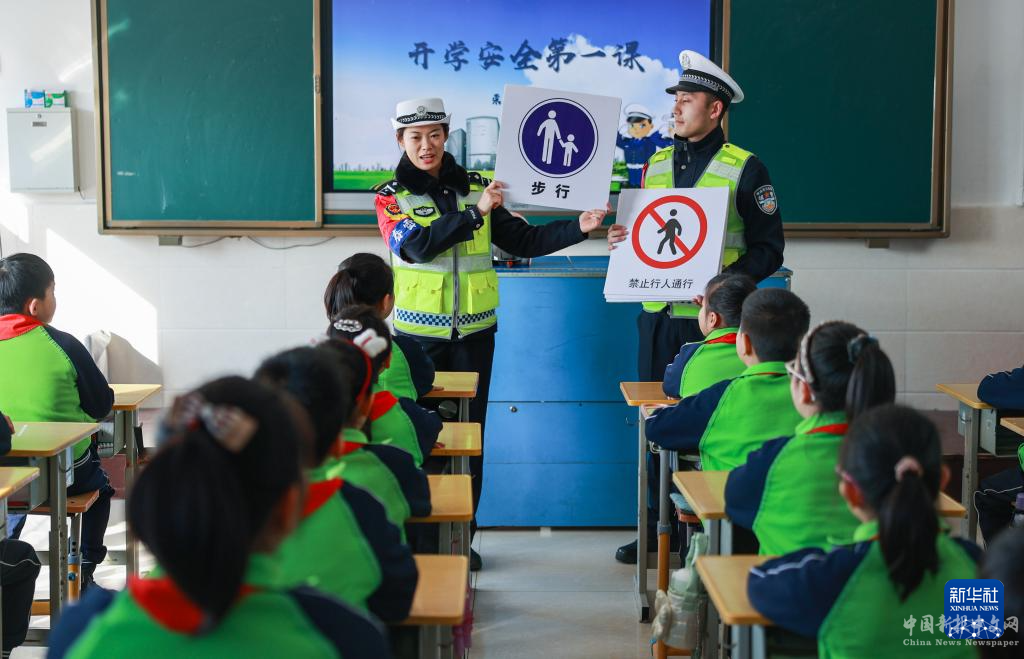 2月26日,在山東省榮成市府新小學(xué)教室內(nèi),交警在學(xué)期第一天為學(xué)生講解各類道路交通安全標(biāo)識(shí)。