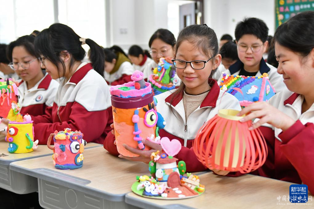 2月26日,湖北省襄陽市海容小學(xué)學(xué)生在校園觀賞剪紙繪畫燈籠等作品。