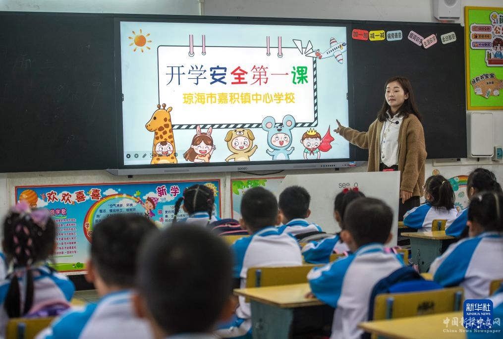 2月26日,海南省瓊海市嘉積鎮(zhèn)中心學(xué)校第三小學(xué)的老師在開學(xué)第一課上為學(xué)生進(jìn)行安全教育。