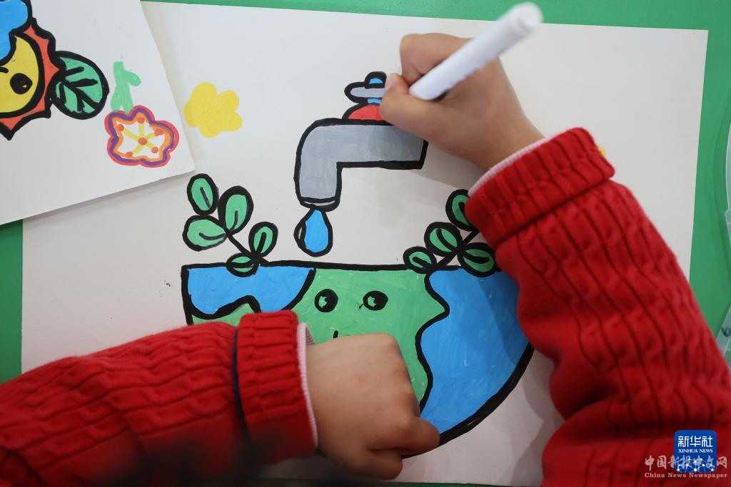 3月21日,河南省開(kāi)封市新街口幼兒園的小朋友在畫(huà)節(jié)水主題圖畫(huà)。