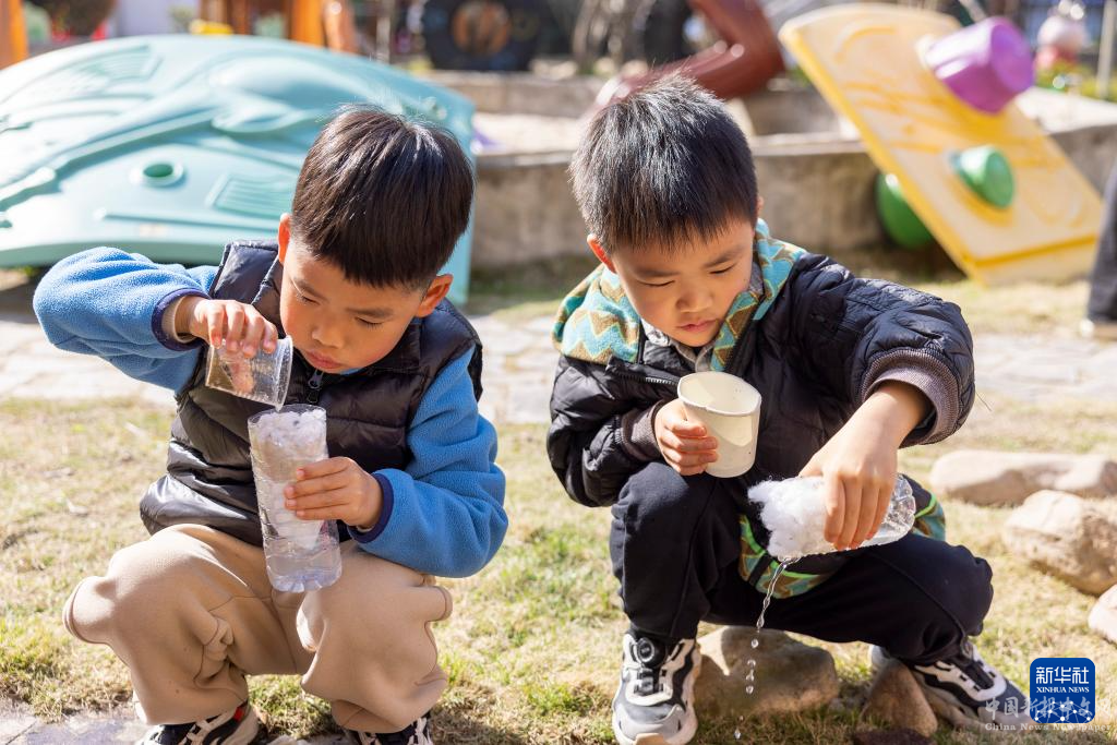 3月21日,浙江省諸暨市城東幼兒園的小朋友在園內(nèi)的水池邊取水放入自制凈水器。