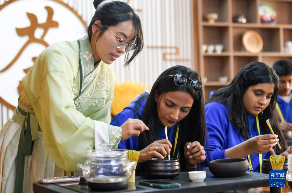 4月15日,參加春令營的來華青年學生在新疆師范大學學生(左)的指導下學習茶藝。