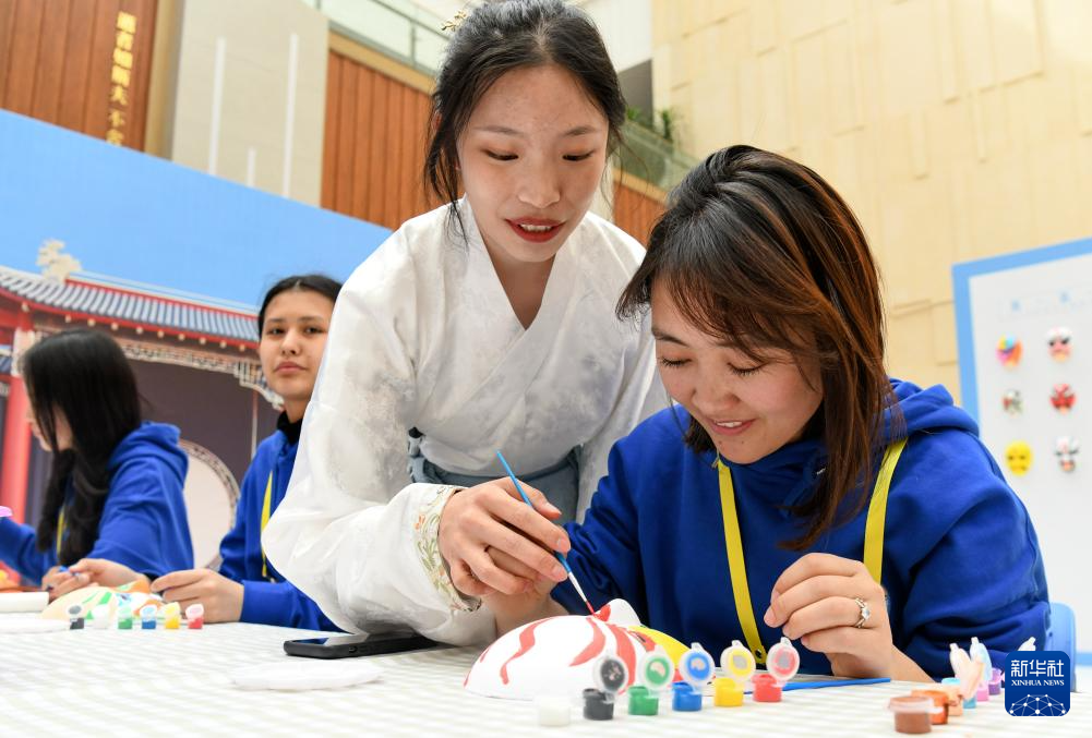 4月15日,參加春令營的來華青年學生在新疆師范大學學生(中)的指導下繪制京劇臉譜。