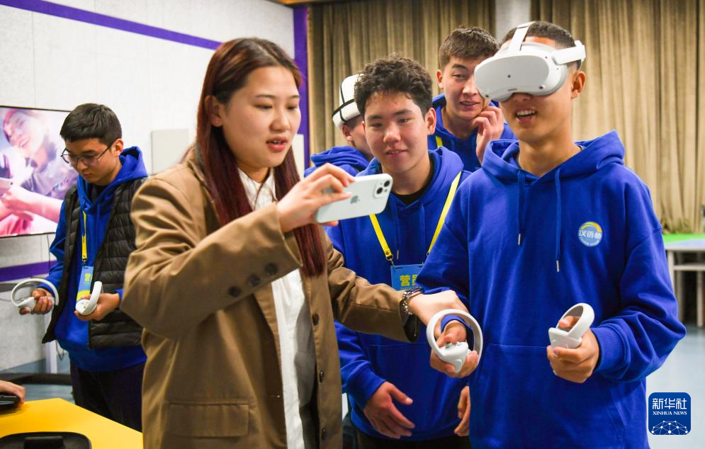 4月15日,參加春令營的來華青年學生在新疆師范大學學生(左二)的引導下體驗VR等設施。