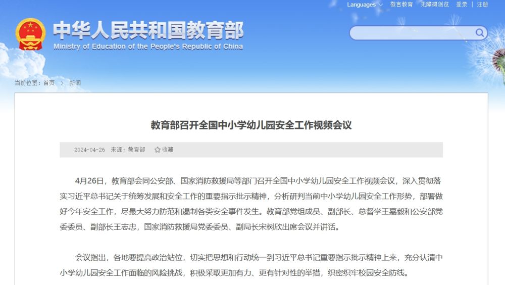 4月26日,教育部會同公安部、國家消防救援局等部門召開全國中小學幼兒園安全工作視頻會議,深入貫徹落實習近平總書記關(guān)于統(tǒng)籌發(fā)展和安全工作的重要指示批示精神,分析研判當前中小學幼兒園安全工作形勢,部署做好今年安全工作,盡最大努力防范和遏制各類安全事件發(fā)生。教育部黨組成員、副部長、總督學王嘉毅和公安部黨委委員、副部長王志忠,國家消防救援局黨委委員、副局長宋樹欣出席會議并講話。