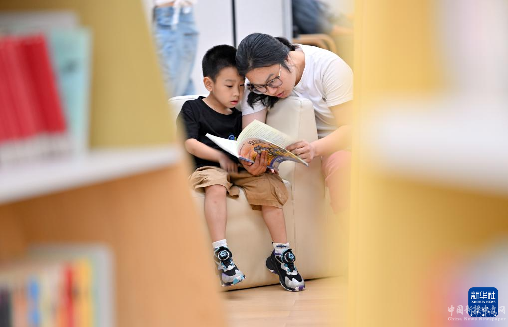 5月2日,家長帶著孩子在位于??谑械暮D鲜D書館讀書。
