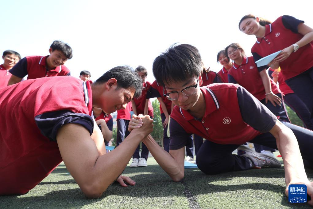5月14日,在河北省石家莊市第二十二中學(xué),高三學(xué)生進行掰手腕比賽。