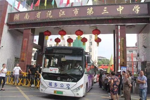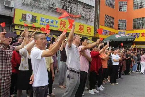 9時整,在值勤警車的領航下,送考車隊準時啟動,緩緩駛過“壯行道”。圍觀的學弟學妹及觀禮的家長們高舉祝福的橫幅、揮動鮮艷的彩旗,為“出征”的學子送上最誠摯的祝愿。“高考加油”“高考必勝”“三中加油”“三中必勝”等助威聲、吶喊聲、號鼓聲響徹三中校園,此起彼伏。
