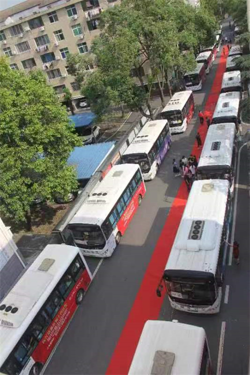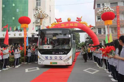 最后,彭立亞校長向高三學生代表授校旗,飄揚的旗幟下,振奮的歌聲中,高三學子在班主任的帶領下沿紅毯有序走過“金榜題名”門,乘上高考送考車。