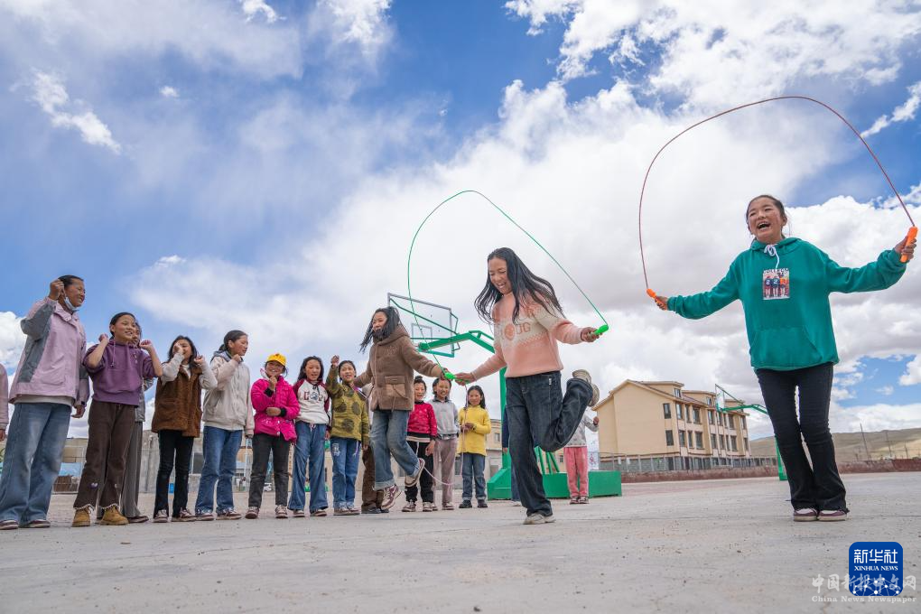 班戈縣中石化小學學生尼瑪措姆(右二)和同學們在操場上跳繩(6月22日攝)。