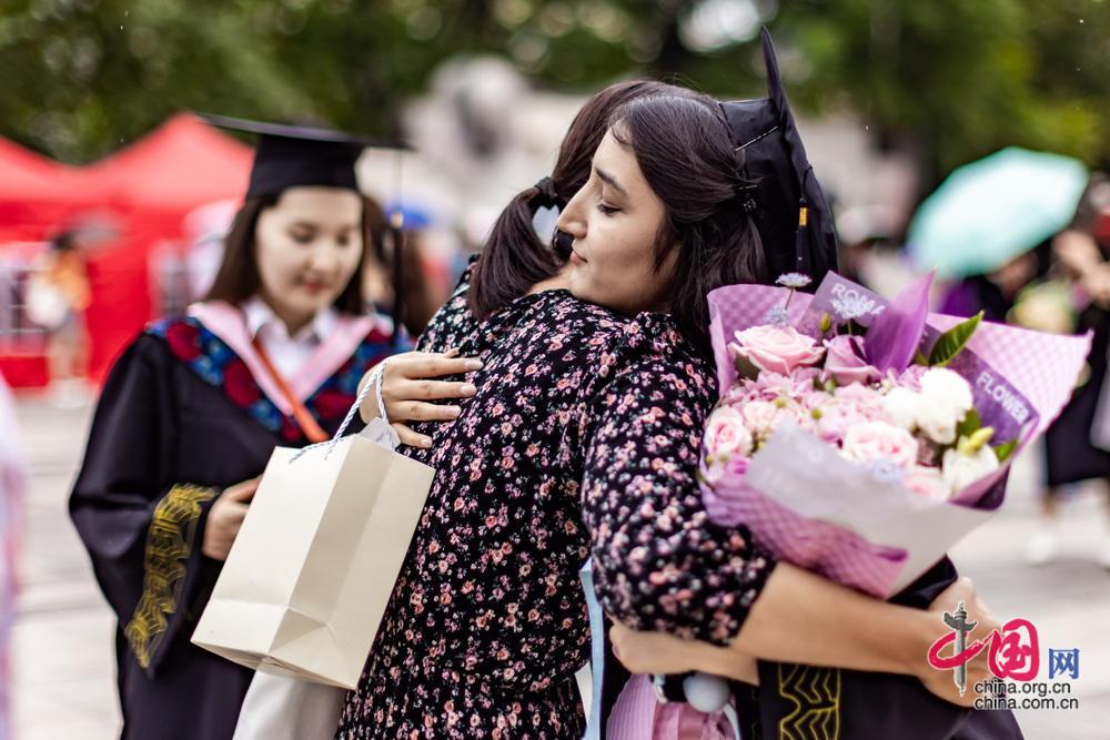 走出畢業(yè)典禮會(huì)場(chǎng)的學(xué)生與家長(zhǎng)相擁慶祝。中國(guó)網(wǎng)記者 鄭亮攝