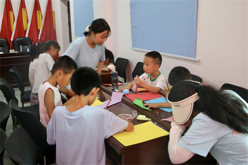 課程以互動問答開場,孩子們踴躍分享心中高陽村的美景為后續(xù)創(chuàng)作埋下了情感伏筆。隨著課程的深入,實踐團成員鼓勵孩子們圍繞“我們該如何優(yōu)化家鄉(xiāng)的生態(tài)環(huán)境”這一主題展開想象與創(chuàng)作。他們耐心指導,逐步引導孩子們將環(huán)保理念融入到手工作品之中。在廢舊紙殼上構(gòu)建的高陽村模型上,孩子們用彩筆、手工繪畫制作出心中的理想家園。最后,孩子們自信展示自己的作品,講述背后的環(huán)保故事。