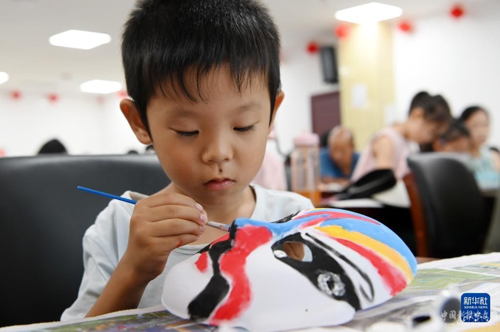 8月16日,在河南省沁陽市圖書館,小朋友在“巧手繪臉譜,妙筆傳國粹 ”活動中繪制戲劇臉譜。