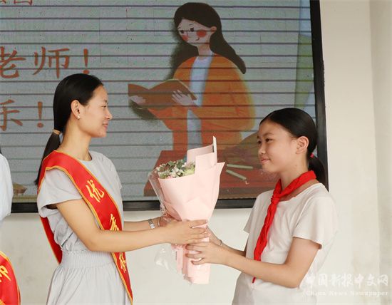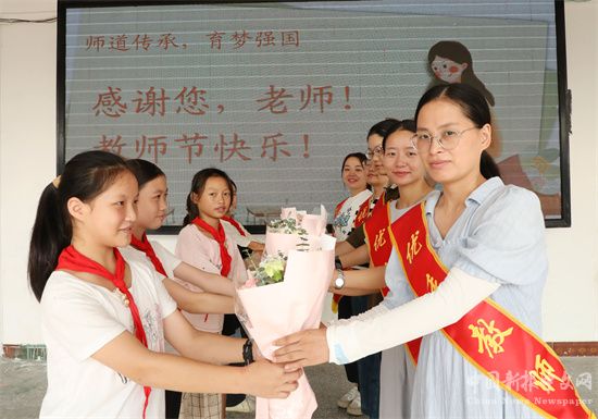 9月10日,在湖南省保靖縣清水坪學(xué)校,學(xué)生向老師獻(xiàn)花。當(dāng)日是教師節(jié),該學(xué)校關(guān)工委組織開展“感謝老師”主題活動(dòng),學(xué)生們以行敬師禮、手工制作禮物、獻(xiàn)花等方式表達(dá)對老師的感恩之情。(俞采華 陳亞平)