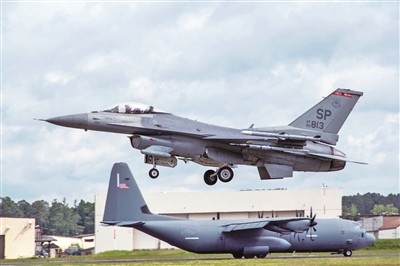 演習(xí)期間,一架F-16戰(zhàn)斗機(jī)和一架C-130J運(yùn)輸機(jī)進(jìn)行起降作業(yè)。