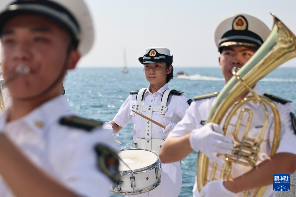 7月21日,在中國海軍主辦的首屆“海軍杯”國際帆船邀請賽開幕式上,大連艦艇學(xué)院軍樂隊演奏《人民海軍向前進(jìn)》。新華社發(fā)(李昊天 攝)