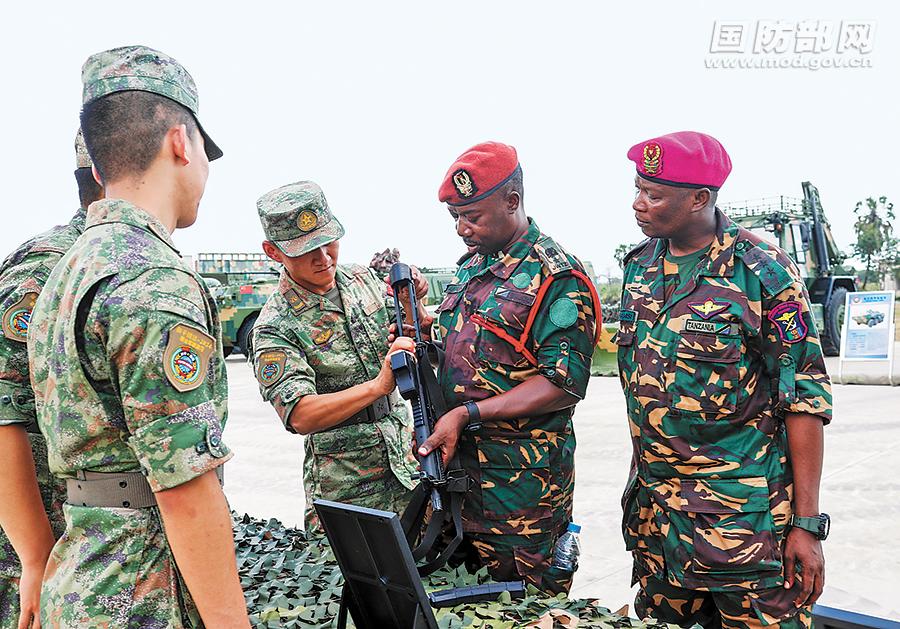 中方在開(kāi)幕式結(jié)束后舉辦裝備展示活動(dòng),安排專(zhuān)人對(duì)7類(lèi)23種典型武器裝備進(jìn)行展示、講解。記者在現(xiàn)場(chǎng)看到,坦方參演官兵在中方講解員的介紹下,體驗(yàn)水下步槍等中方武器裝備。在無(wú)人平臺(tái)操作區(qū),多名坦方參演官兵圍攏過(guò)來(lái),對(duì)操縱無(wú)人設(shè)備興致盎然。