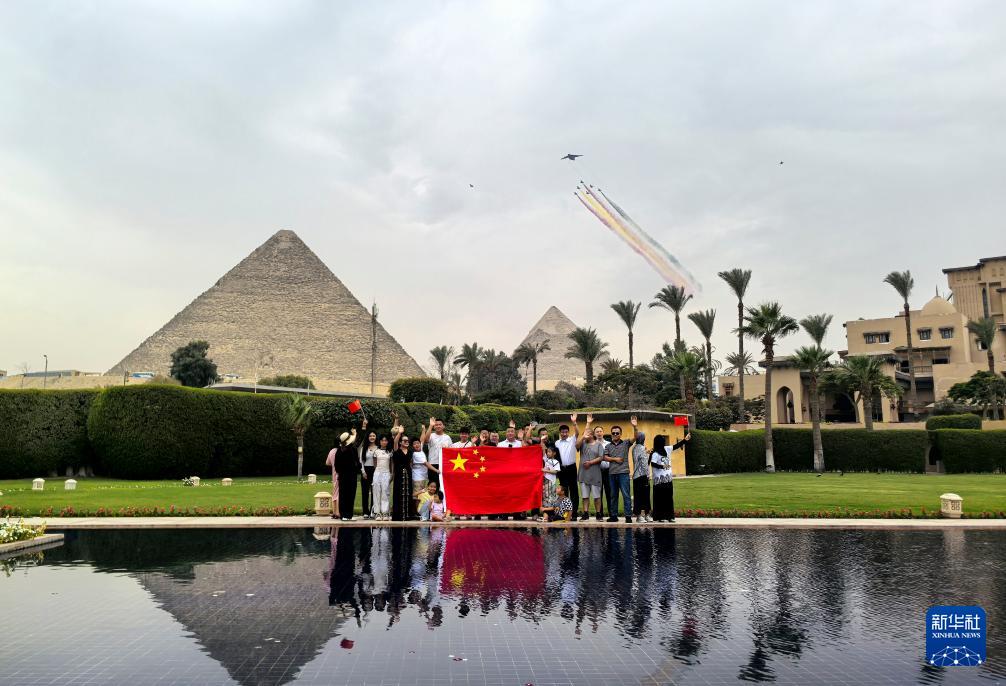 當(dāng)?shù)貢r(shí)間28日中午,中國空軍1架運(yùn)-20與空軍八一飛行表演隊(duì)6架殲-10表演機(jī)編隊(duì)飛越金字塔上空,殲-10表演機(jī)在空中拉出象征中埃兩國國旗顏色的6道彩煙,吉薩金字塔景區(qū)內(nèi)的觀眾爭相合影留念。