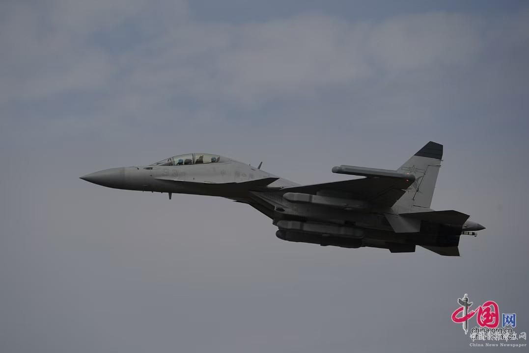 11月9日,海軍殲-15系列艦載機(jī)編隊(duì)在珠海進(jìn)行適應(yīng)性訓(xùn)練,殲-15D首次公開亮相。殲-15D是一型雙座艦載電子戰(zhàn)飛機(jī),集電子干擾及打擊等能力于一體,可在未來(lái)航母編隊(duì)奪取制空權(quán)中發(fā)揮重要作用。中國(guó)網(wǎng)記者 楊佳 攝影