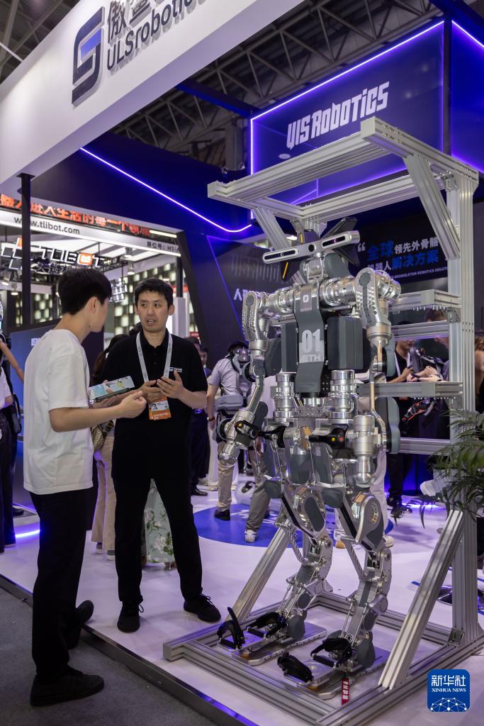 7月4日,一名參觀者穿上“智能外骨骼”輕松舉起數(shù)十公斤的水袋。