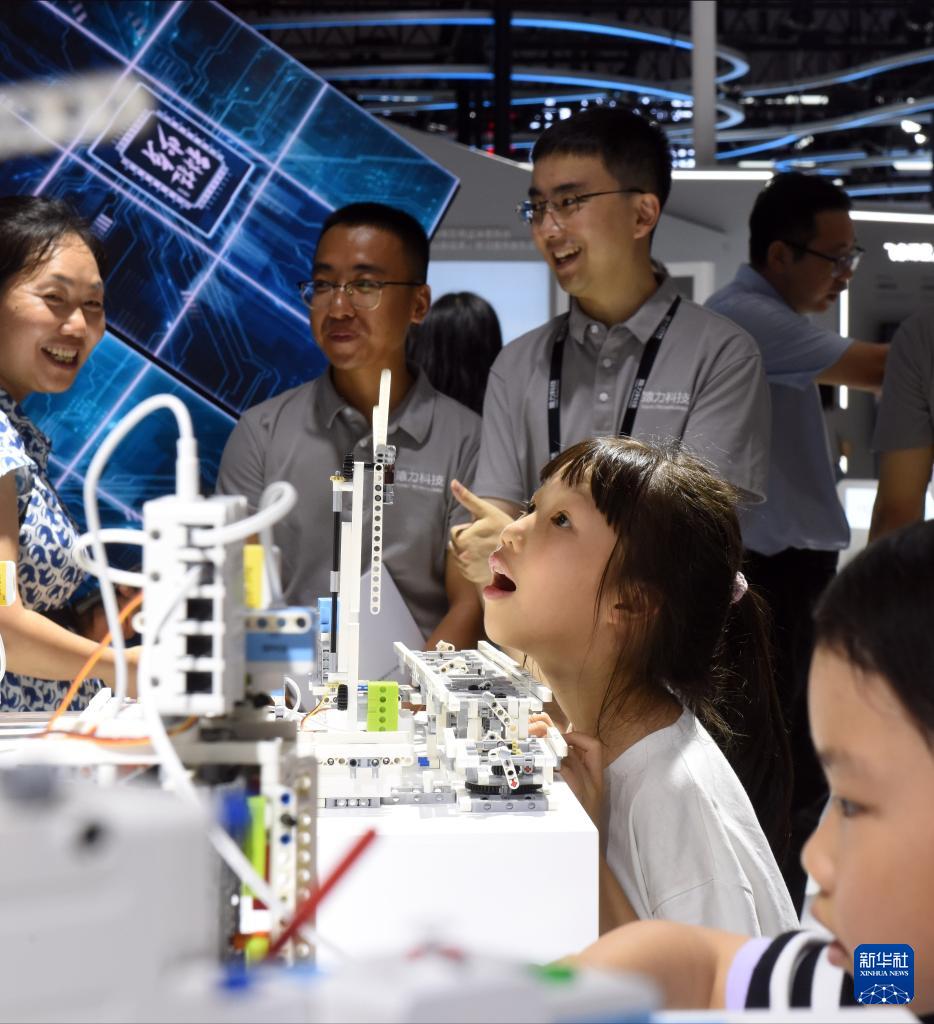 7月4日,在猿力科技展臺,兩名女孩在體驗“編程智能硬件”。